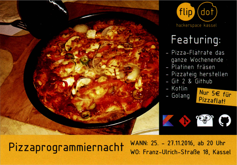 Wir hacken nicht nur, wir backen auch. In unserem neuen Gastro-Pizzaofen: Große Mengen Pizza, bis jeder satt ist. Währenddessen kannst du coden, löten, fräsen, Git und Github kennen lernen, dich mit Kotlin und Golang beschäftigen, und dich im Hackerspace umschauen. Start am Freitag um ca 20:00, Ende am Sonntag.