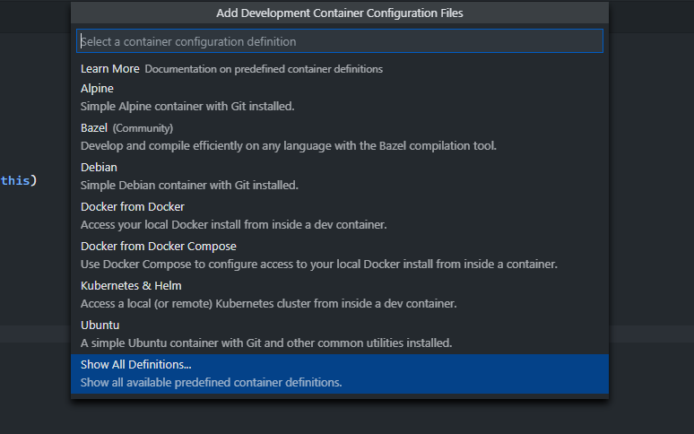 Wir erhalten nun eine Liste mit vordefinierten Containern, aus den man sich einen Passenden aussuchen kann. Durch einen Klick auf „Show all Definitions“ lässt sich eine Vielzahl weiterer möglicher Umgebungen wie zum Beispiel für Java, C++, C#, Go und vielen mehr anzeigen.