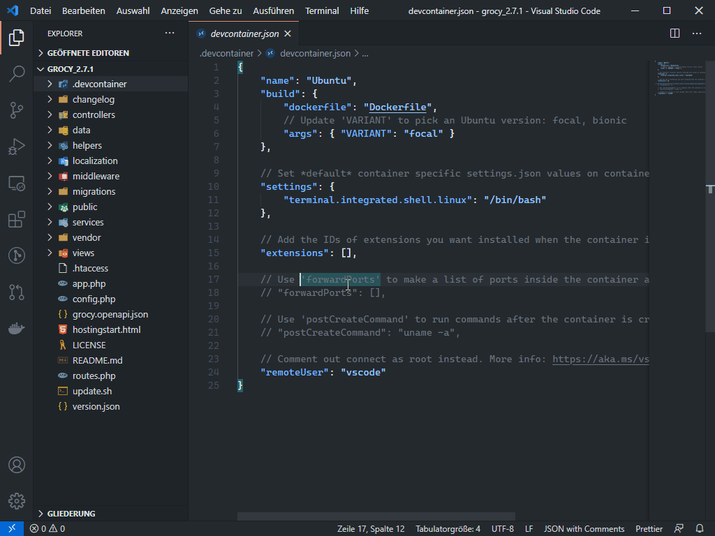 Die .devcontainer.json ist die wichtigste Konfigurationsdatei. In ihr werden Einstellungen für die neue Entwicklungsumgebung wie Docker Container Parameter oder VS Code Extensions vorgenommen, die nach dem Start des Containers zur Verfügung stehen sollen.